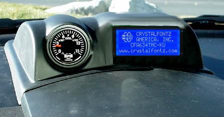 | This is just a gimp'd up concept drawing of what I hope the gauge pod will look like with the LCD. The sizing is just a guess right now. Once the pod shows up, I'll measure it and order the closest approximation of what I want. The LCD will be used to display not only Song information, but OBD-II statistics as well. There will be a boost gauge in there. I'm undecided on red or blue lighting for the gauge. |