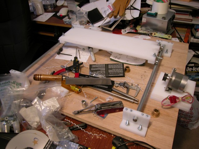 Finally completed mechanically. I am certain to have some issues to deal with, but now I can work on the stepper drivers. A dremel flex shaft was used to reduce the load on the steppers, get something with ball bearings, and have something easily mounted. Making a holder for the larger tool would have been a pain and the cheap variable speed tool I use has cruddy bushings while the dremel attachment either has nice new bushings or even ball bearings. |