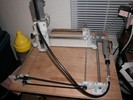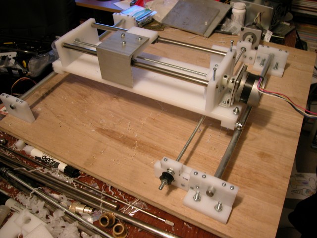 X and Y axis are both nearly completed. There is too much deflection(in my opinion) on the X axis. The carrige is so long and narrow that it's difficult to keep it properly aligned. I plan to add a second allthread and connect the two with a belt drive. |
