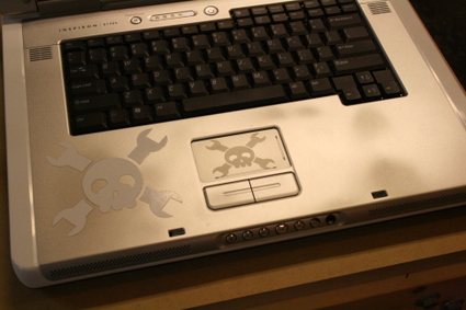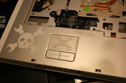 To fit the machine in the laser cutter without disabling any of the safety interlocks, I removed the display. On the E1705 it's just a bezel cover, four screws, the keyboard (two more screws), and the wireless antenna cable (two screws on the back cover to access).